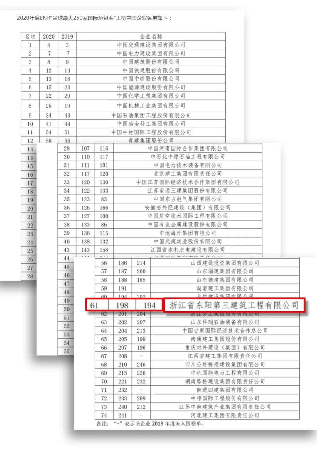 2020年8月21日,2020年度美国《工程新闻纪录(ENR)》“全球最大250家国际承包商”榜单发布。东阳三建继2019年首次登榜后,今年再次登榜,列全球第198名,列74家登榜中资企业第61名,也是金华地区唯一一家登榜的企业。